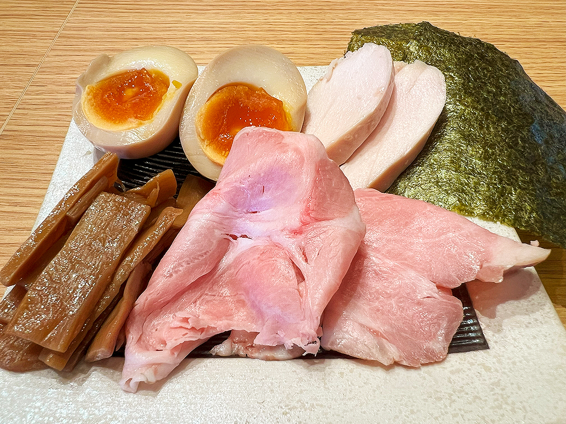 「極」メニューには、別皿トッピング(鶏チャーシュー・ローストポーク・味玉・メンマ・海苔)が付いてきますよ♪