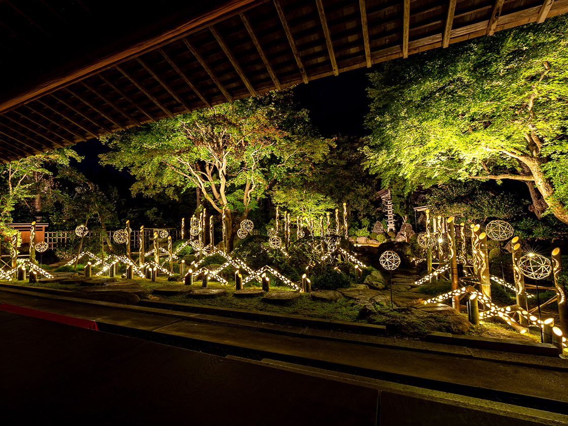 大正時代に建てられた豪農の館「椿寿荘」では、枯山水の庭園を竹あかりでライトアップ♪