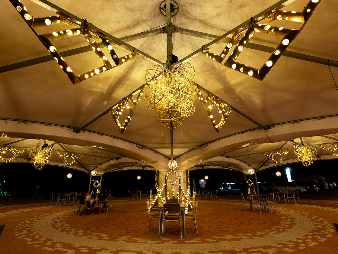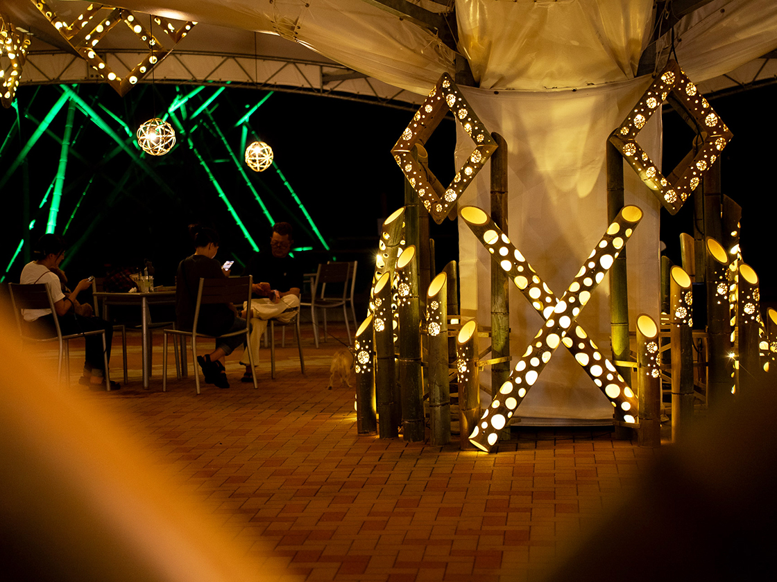 夜には、「憩いの広場」に展示されたバンブーアートが優しい光を放ちます!