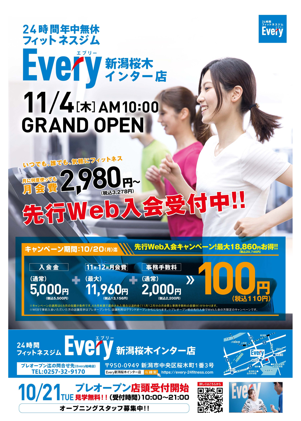 24時間フィットネスジム『Every(エブリー) 新潟桜木インター店』が11月4日(火)にオープンしますよ!