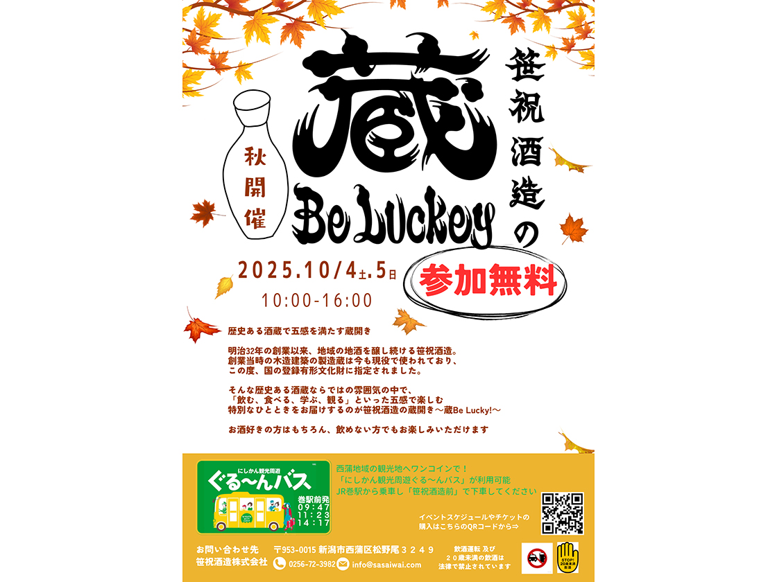 - 笹祝酒造の蔵Be Lucky!~秋開催~:2025年10月4日(土)・5日(日) 10:00~16:00