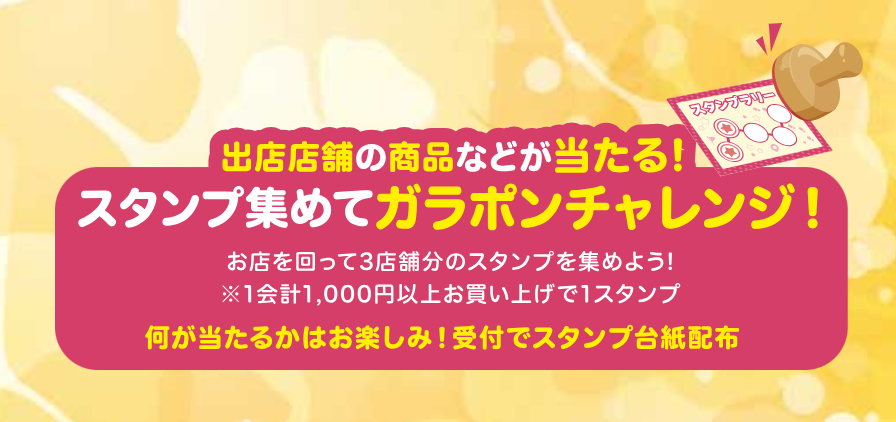 1会計1,000円以上でもらえるスタンプを3店舗分集めると、ガラポンにチャレンジできますよ!