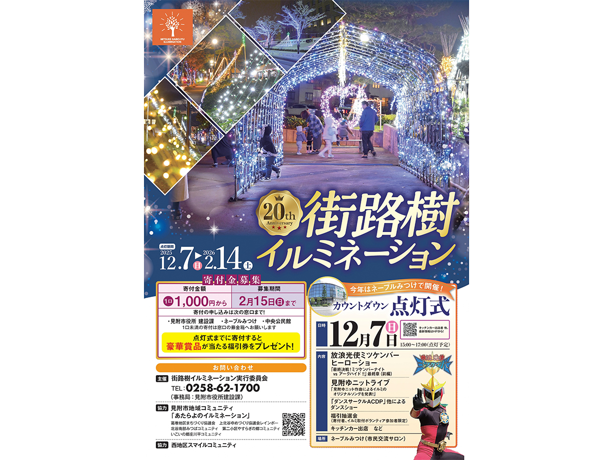 TOP > イベント > 【見附市】“県内最長級”の光のトンネル♪20年続く『街路樹イルミネーション 2025』が12月7日から開催!「カウントダウン点灯式」ではヒーローショーも楽しめる♪
