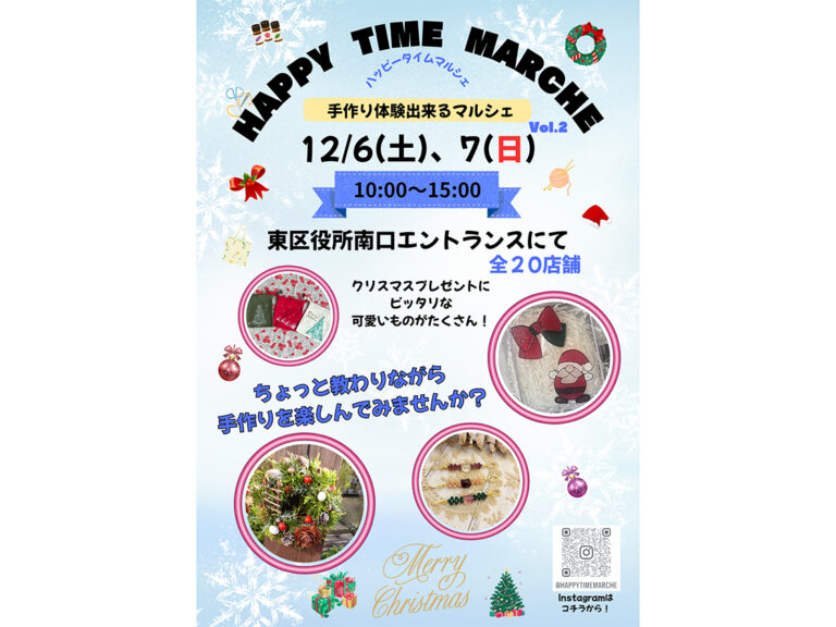 “手作り体験を楽しみたい方”に、おすすめの「イベント情報」をガタチラがお届けします! 『HAPPY TIME MARCHE Vol.2(会場:東区役所南口エントランス)』が12月6日(土)・7日(日)に開催されますよ♪ … 続きを読む 【新潟市東区】手作り雑貨の体験イベント『HAPPY TIME MARCHE Vol.2』が12月6日・7日に開催!“クリスマスのオリジナルグッズ”を手作りしよう♪
