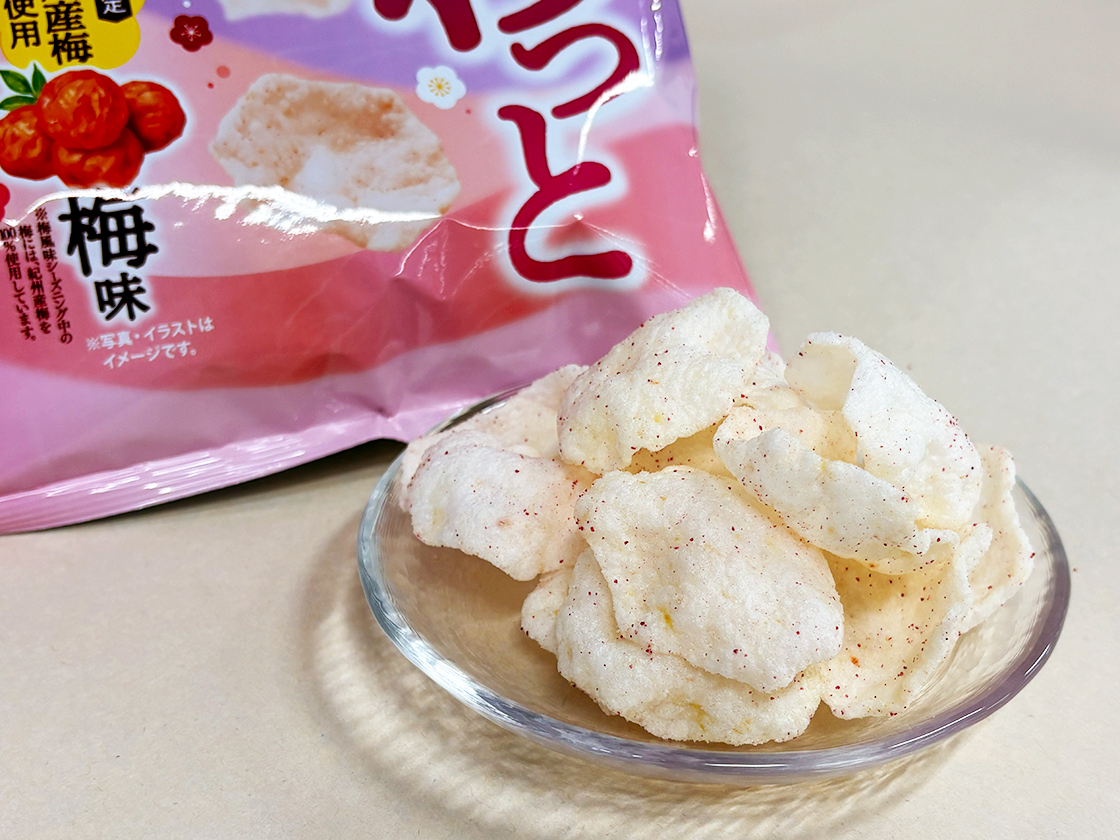 極限まで薄くした生地を“紀州南高梅の梅風味シーズニング”で味付けしていて、とろける食感と梅の酸味がヤミツキになりますよ!