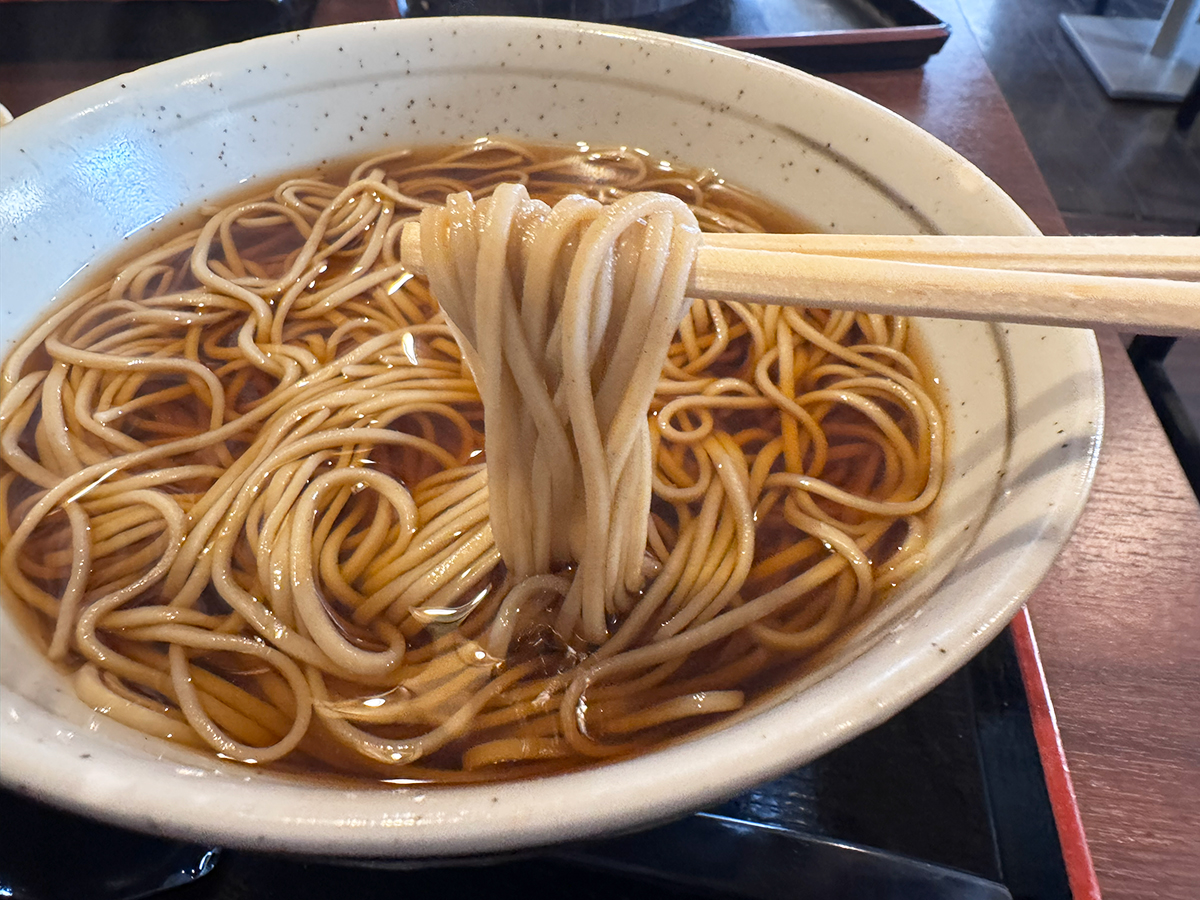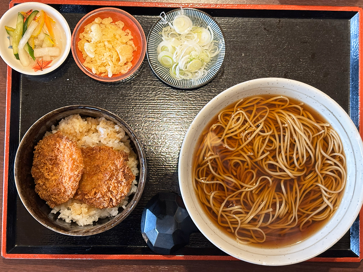 セットの「かけそば」は、あっさりとした出汁が効いていて、タレカツ丼の甘辛さとのバランスが絶妙♪