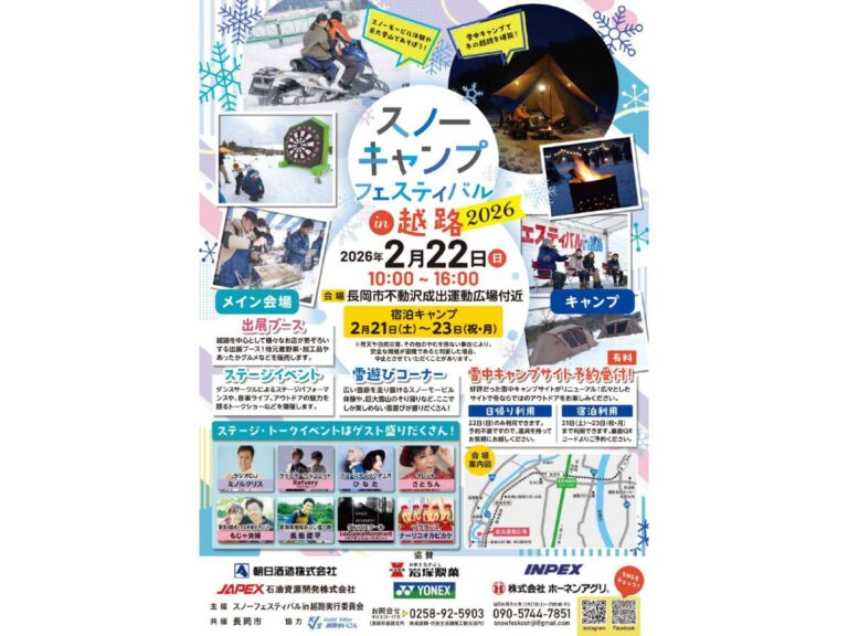 “雪中キャンプを楽しみたい方”に、おすすめの「イベント情報」をガタチラがお届け! 『スノーキャンプフェスティバル in越路 2026(会場:長岡市不動沢成出運動広場付近)』が2月22日(日)に開催されますよ♪ 雪遊びや雪 … 続きを読む 【長岡市】雪遊び&雪中キャンプを体験できる『スノーキャンプフェスティバル in越路 2026』が2月22日に開催!「ひなた」や「Rafvery(ラフベリー)」の音楽ライブで盛り上がろう♪