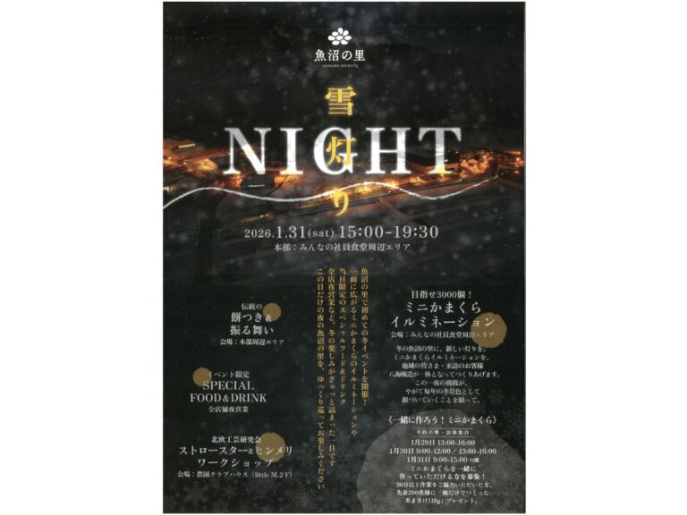 “イルミネーションを楽しみたい方”に、おすすめの「イベント情報」をガタチラがお届け! 『雪灯りNIGHT(会場:魚沼の里)』が1月31日(土)に開催されますよ♪ ミニかまくらの明かりが灯る、「魚沼の里」初の冬イベントです … 続きを読む 【南魚沼市】観光と体験の複合施設「魚沼の里」のナイトイベント♪『雪灯りNIGHT』が1月31日に開催!幻想的な“ミニかまくらイルミネーション”を楽しもう♪