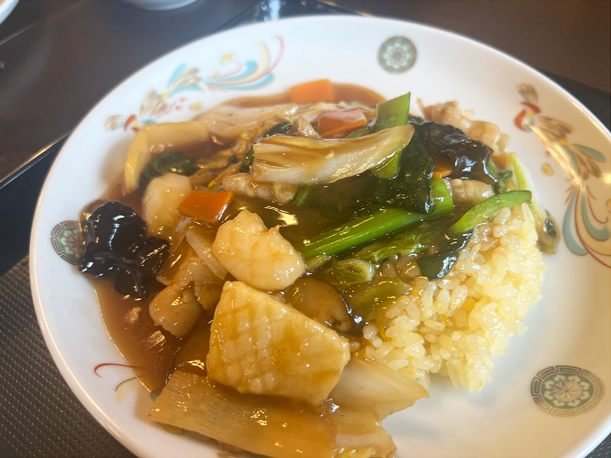 五目あんかけチャーハンは、エビや野菜、きくらげなど具だくさん♪