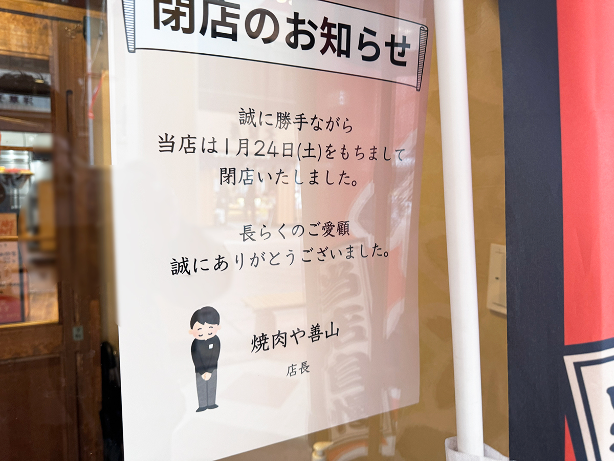 『焼肉や善山(ぜんざん)』が1月24日(土)に閉店したようです。