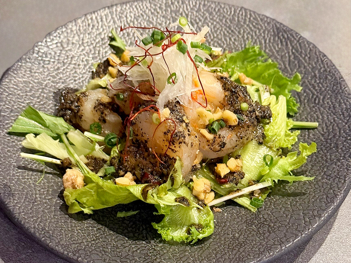 ぷりぷりのエビにコク深い黒ごまベースの特製ダレを絡め、クルミの食感がアクセントになっていますよ!