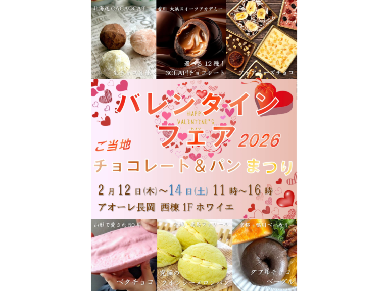 “お出かけ先をお探しの方”に、おすすめの「イベント情報」をガタチラがお届け! 『バレンタインフェア2026 第2弾(会場:アオーレ長岡)』が2月12日(木)~2月14日(土)まで開催されますよ♪ 全国から厳選された“ご当 … 続きを読む 【長岡市】100種類以上のチョコとパンが「アオーレ長岡」に大集合!『バレンタインフェア 2026 第2弾』が2月12日~14日に開催♪ギフト選びはここで決まり!