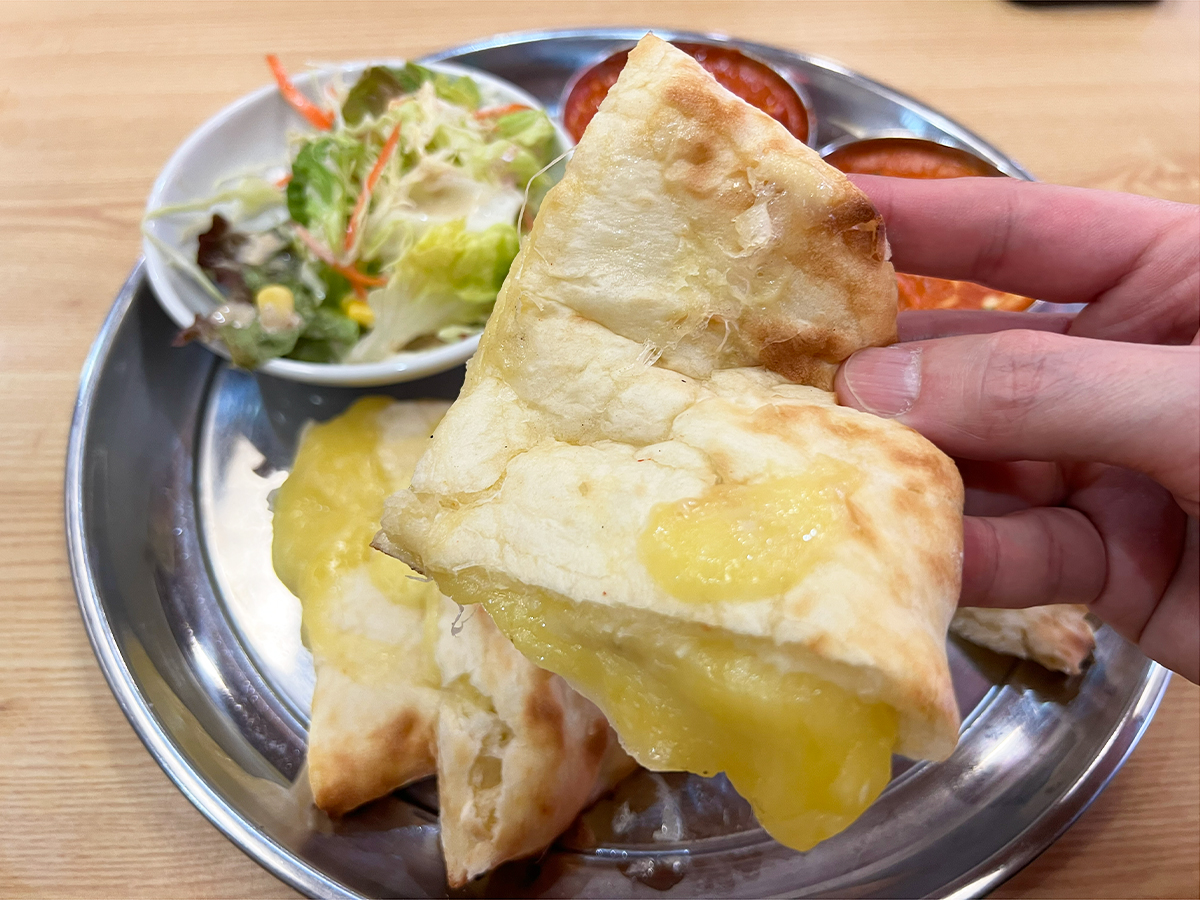 ビジュアルからも期待大な「チーズナン」は、外がカリッと香ばしく、中はもちもち♪