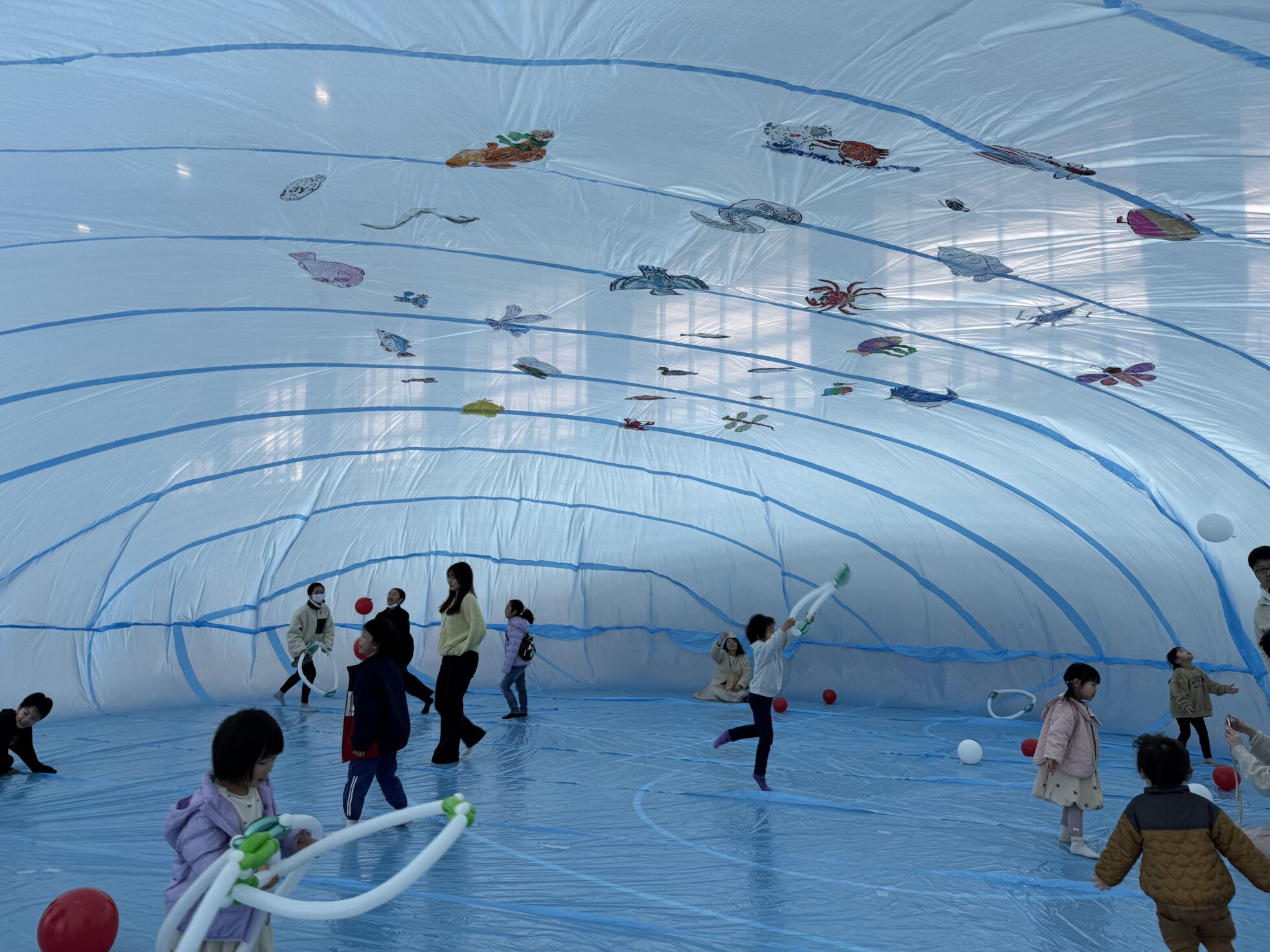 大きなバルーンの中には、潟に住む生き物のイラストや風船がたくさん◎