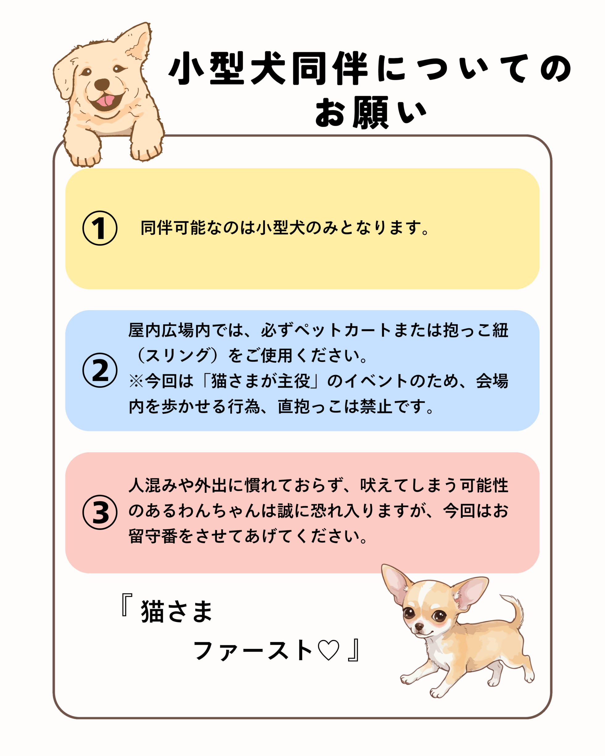 今回は猫が主役のイベントのため、“わんちゃんの同伴は小型犬のみ”となります。