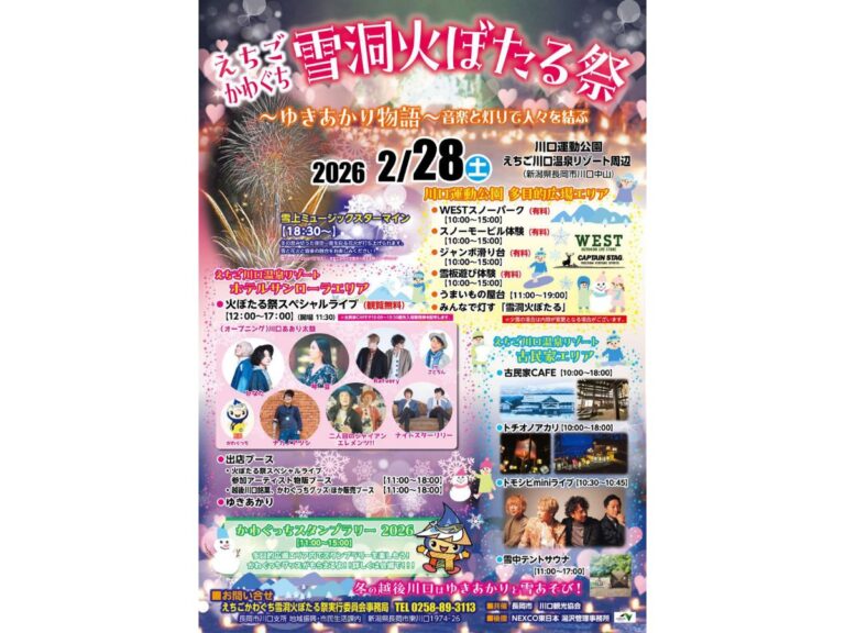 【長岡市】幻想的な「ゆきあかり&雪上花火」を楽しむ♪『えちごかわぐち雪洞火ぼたる祭』が2月28日に開催!豪華アーティストによるライブは必見♪