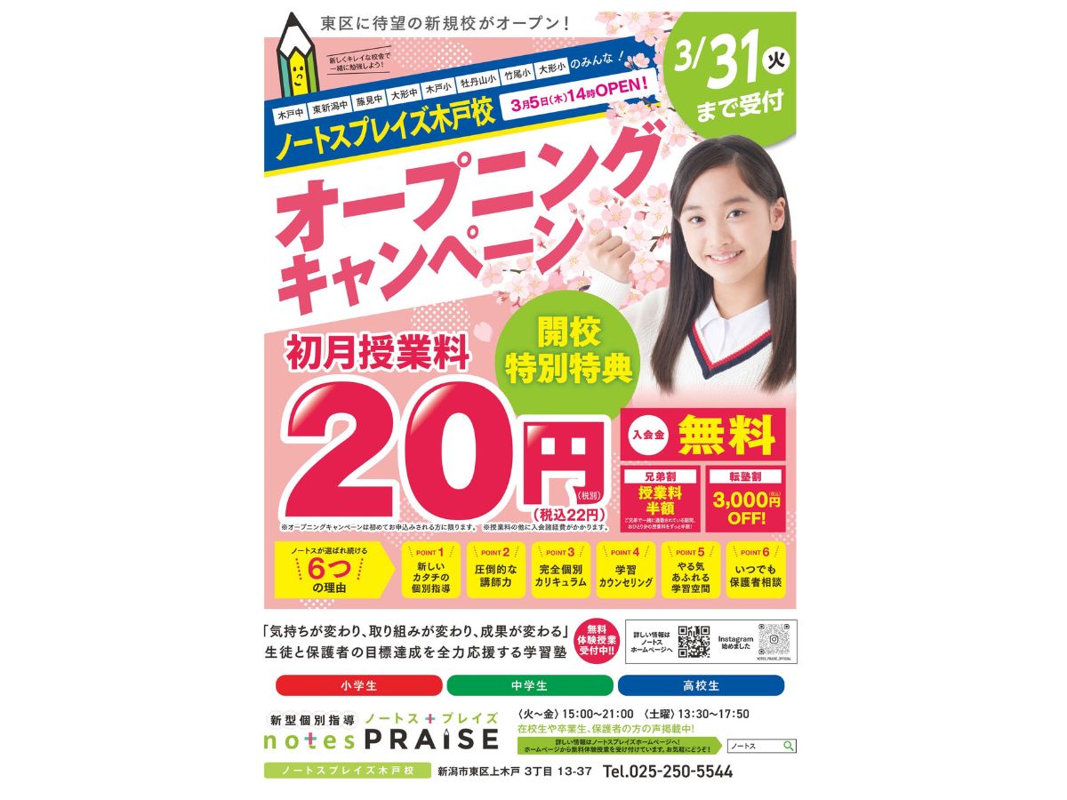 『新型個別指導 ノートスプレイズ 木戸校』が3月5日(木)にオープンしますよ♪