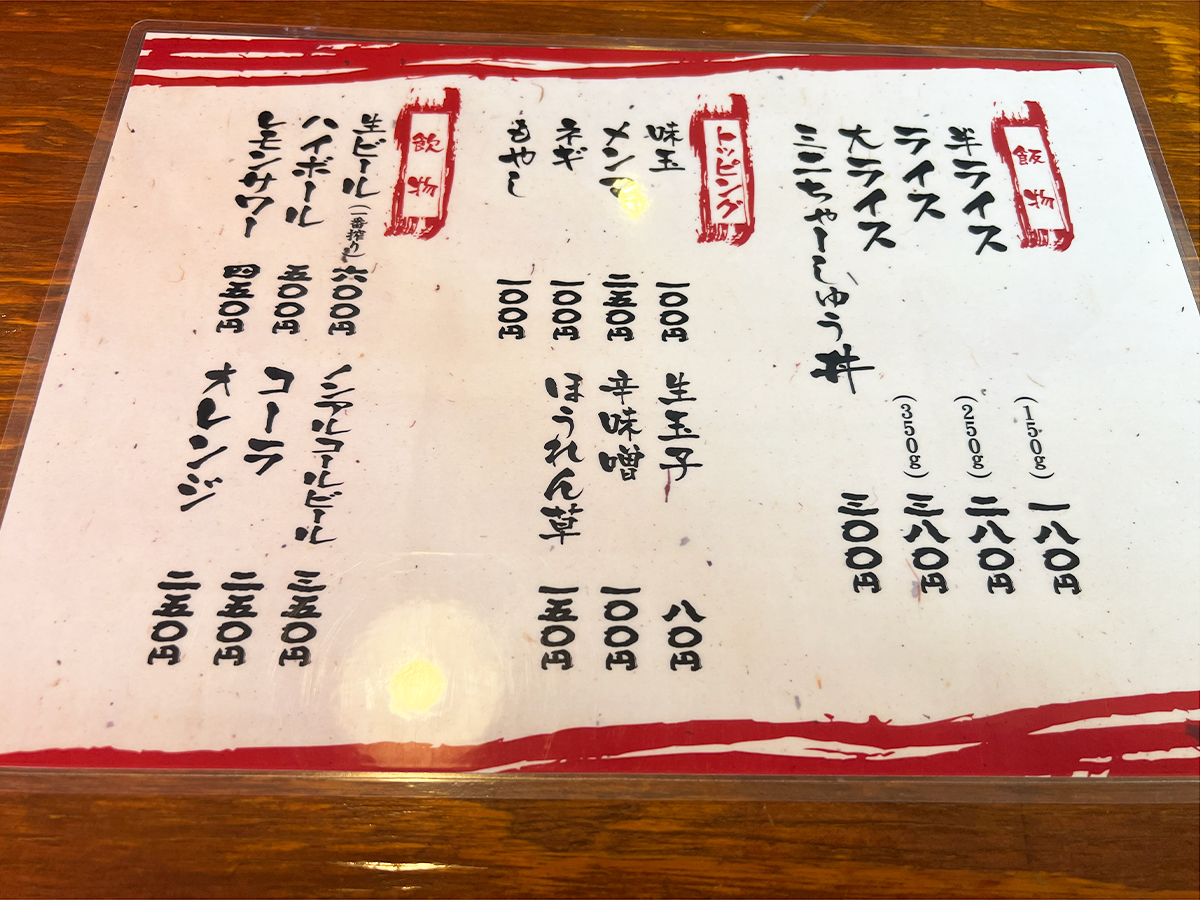 ご紹介したメニューのほかにも、「つけめん ちゃーしゅう(1,000円)」や「辛つけめん ちゃーしゅう(1,100円)」をラインアップ!