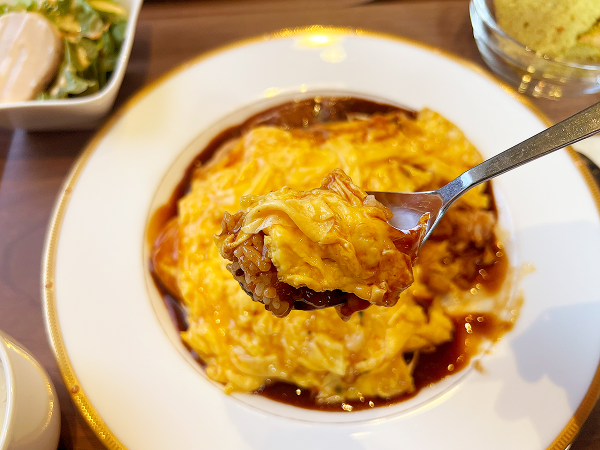 一口食べると、濃厚なデミグラスソースのコクとまろやかな卵の旨みが口いっぱいに広がりますよ!