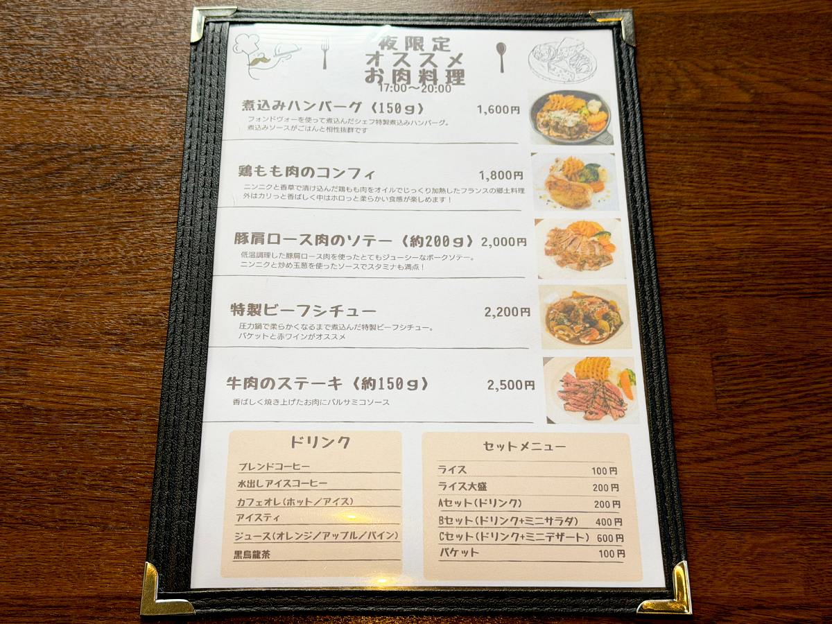 紹介したメニューのほかにも、「鶏もも肉のコンフィ(1,800円)」や「特製ビーフシチュー(2,200円)」など、気になるメニューが盛りだくさん♪
