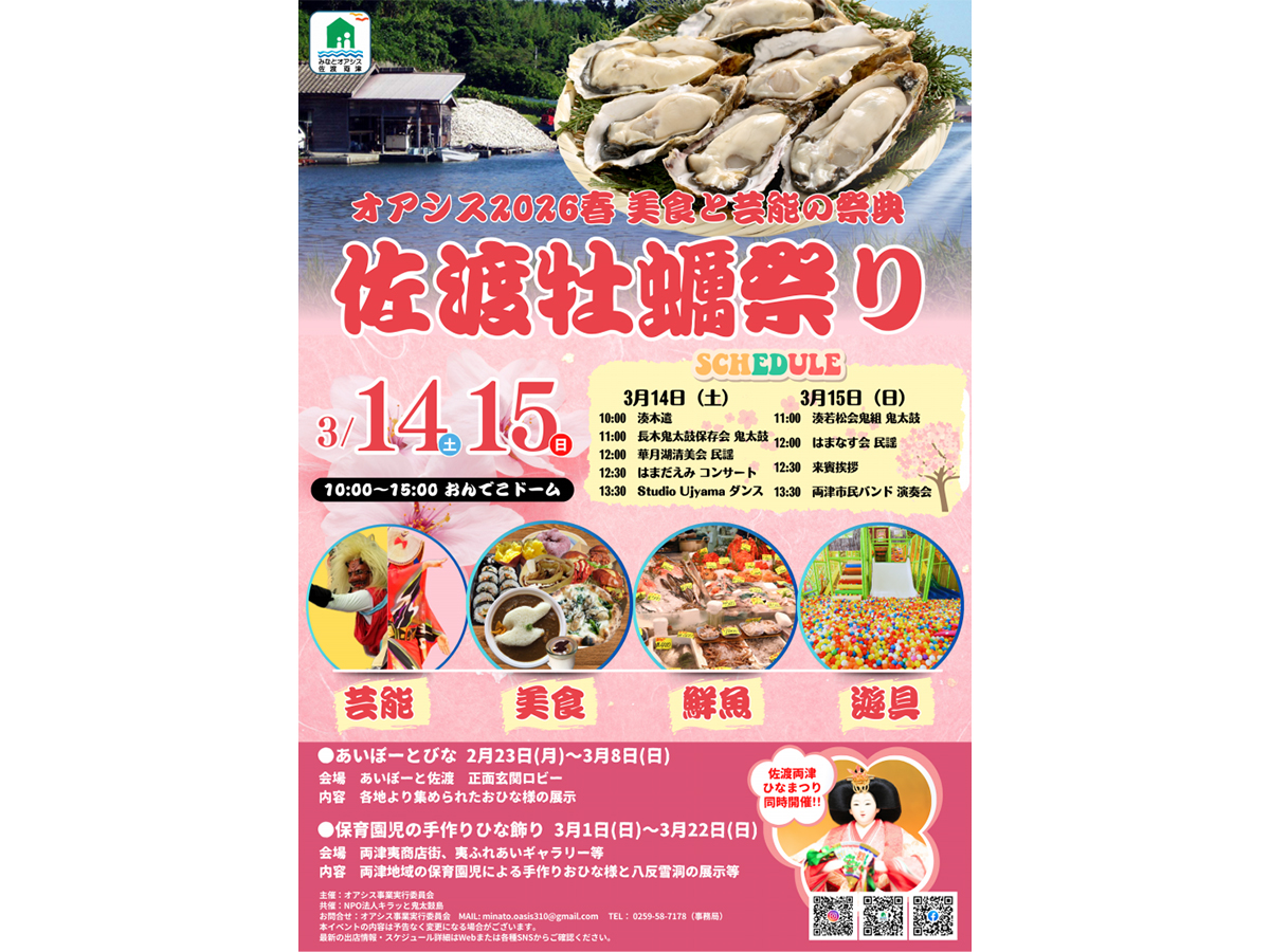『佐渡牡蠣祭り(会場:おんでこドーム)』が3月14日(土)・15日(日)に開催されますよ♪