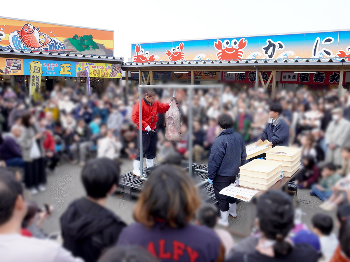 道の駅『マリンドリーム能生」の特設会場で、海洋高校の生徒がつるし切りにチャレンジ!