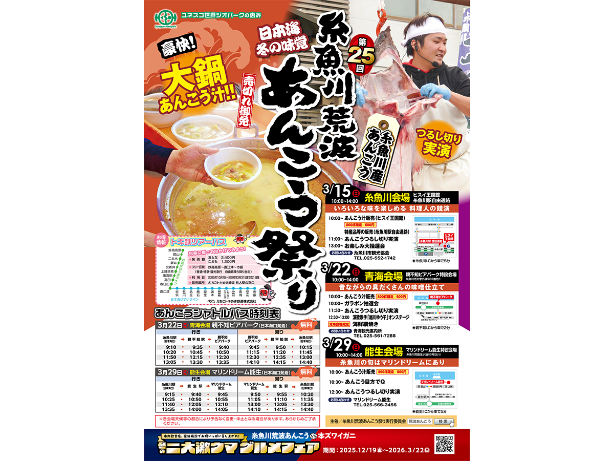 青海会場・能生会場へは、糸魚川駅から無料の「あんこうシャトルバス」が運行されますよ!