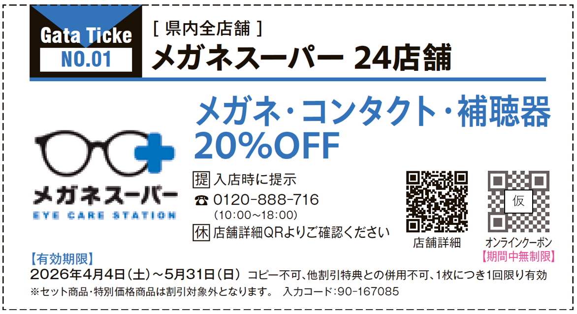 『メガネスーパー』は、県内24店舗で利用できる「メガネ・コンタクト・補聴器20%OFFクーポン」を掲載中です!