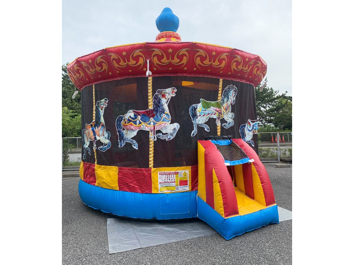 メリーゴーランド型のふわふわ遊具で、飛んだり跳ねたりして遊べますよ!
