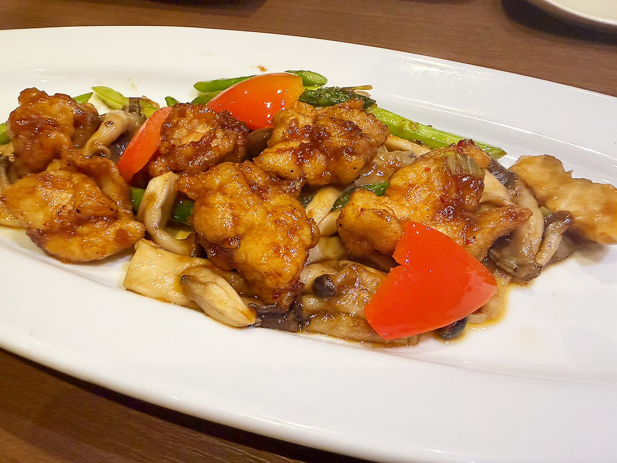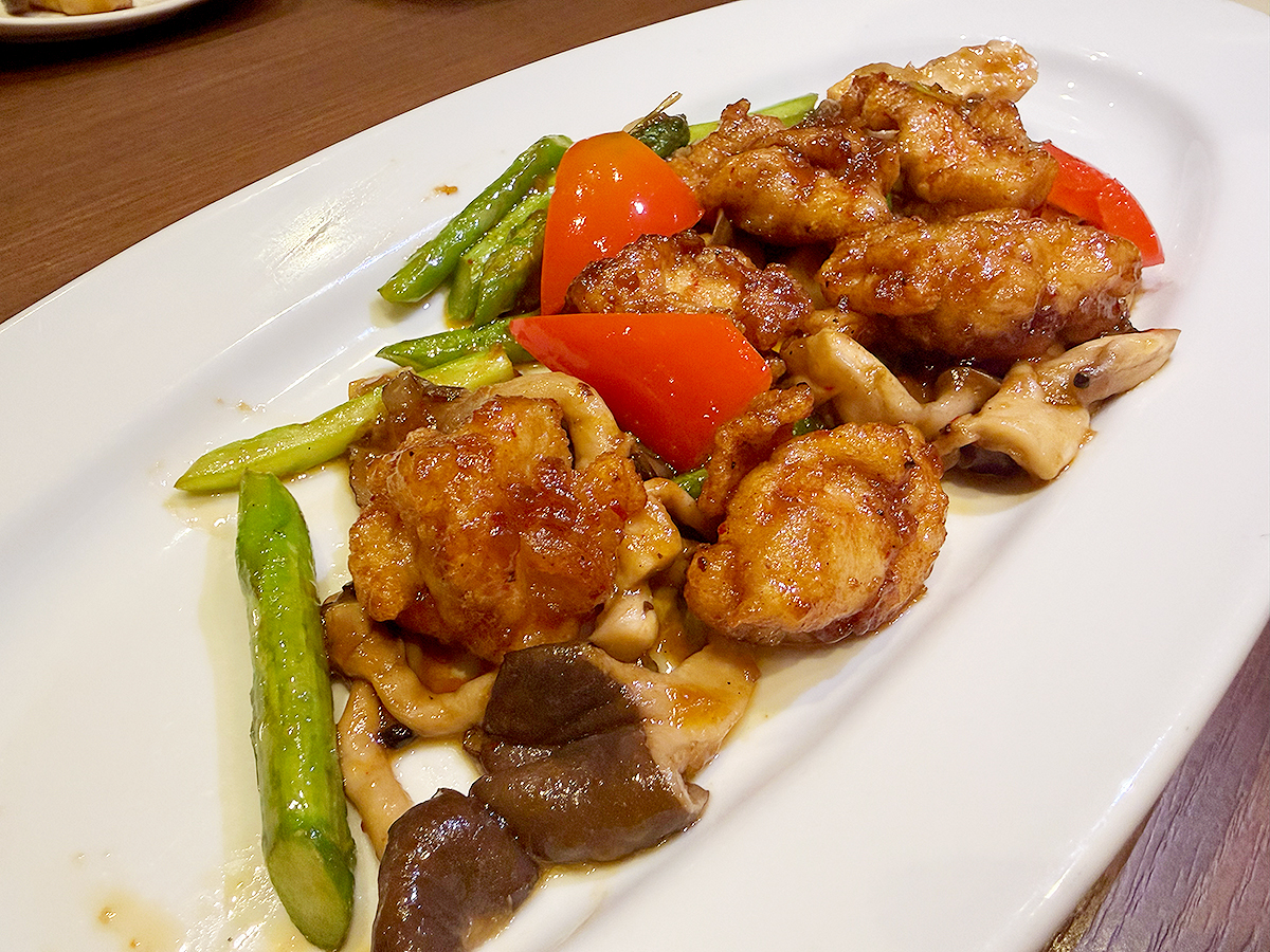 コース中盤の「国産鶏肉ときのこのオイスターソース炒め」は食べ応え抜群!