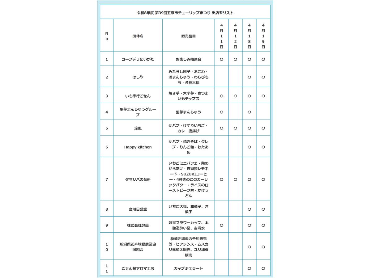 【五泉市】色とりどりのチューリップを楽しもう♪『第39回五泉市チューリップまつり』が4月11日より開催!週末は「地元グルメ・特産品」も登場♪