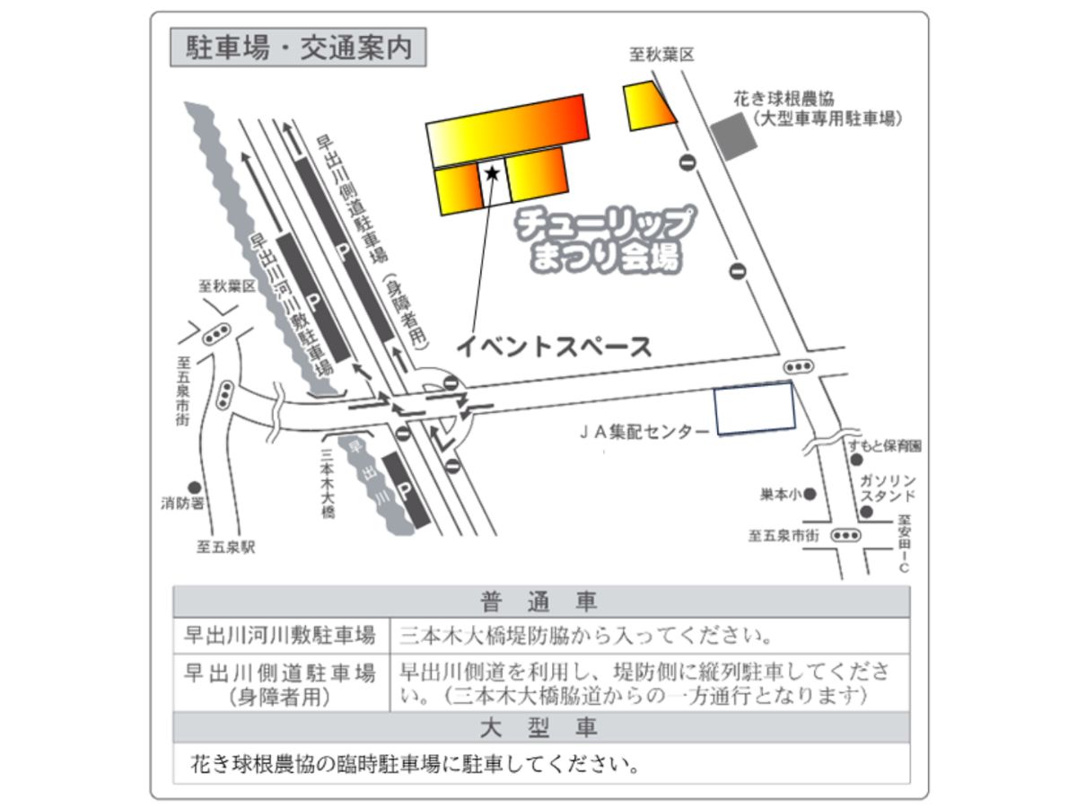 駐車場は「早出川河川敷駐車場(普通車用)/早出川側道駐車場(身障者用)」と「新潟県花卉球根農業協同組合(大型車用)」が利用できますよ♪