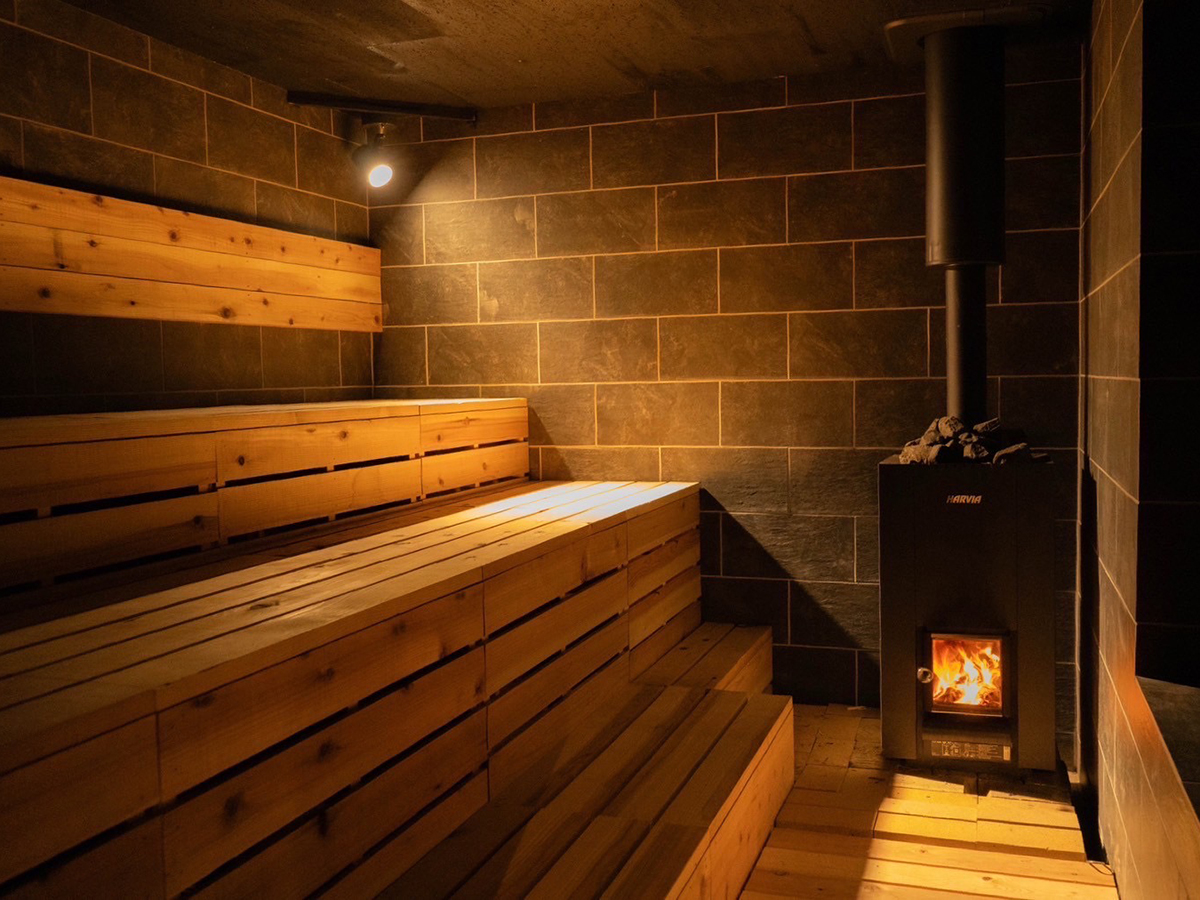 照明を抑えたサウナ室には、薪ストーブを完備♪